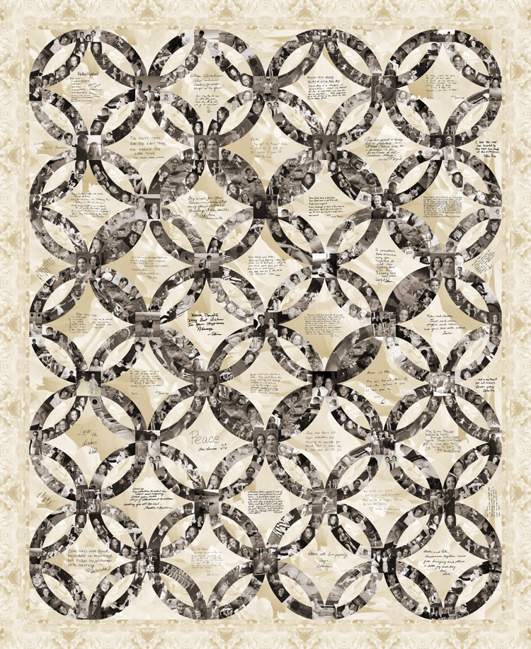 Double Wedding Ring for Alesha and Peter For this quilt I included scanned handwritten messages from their friends and relatives. The sepia tone of the quilt gives it the appearance of age. |